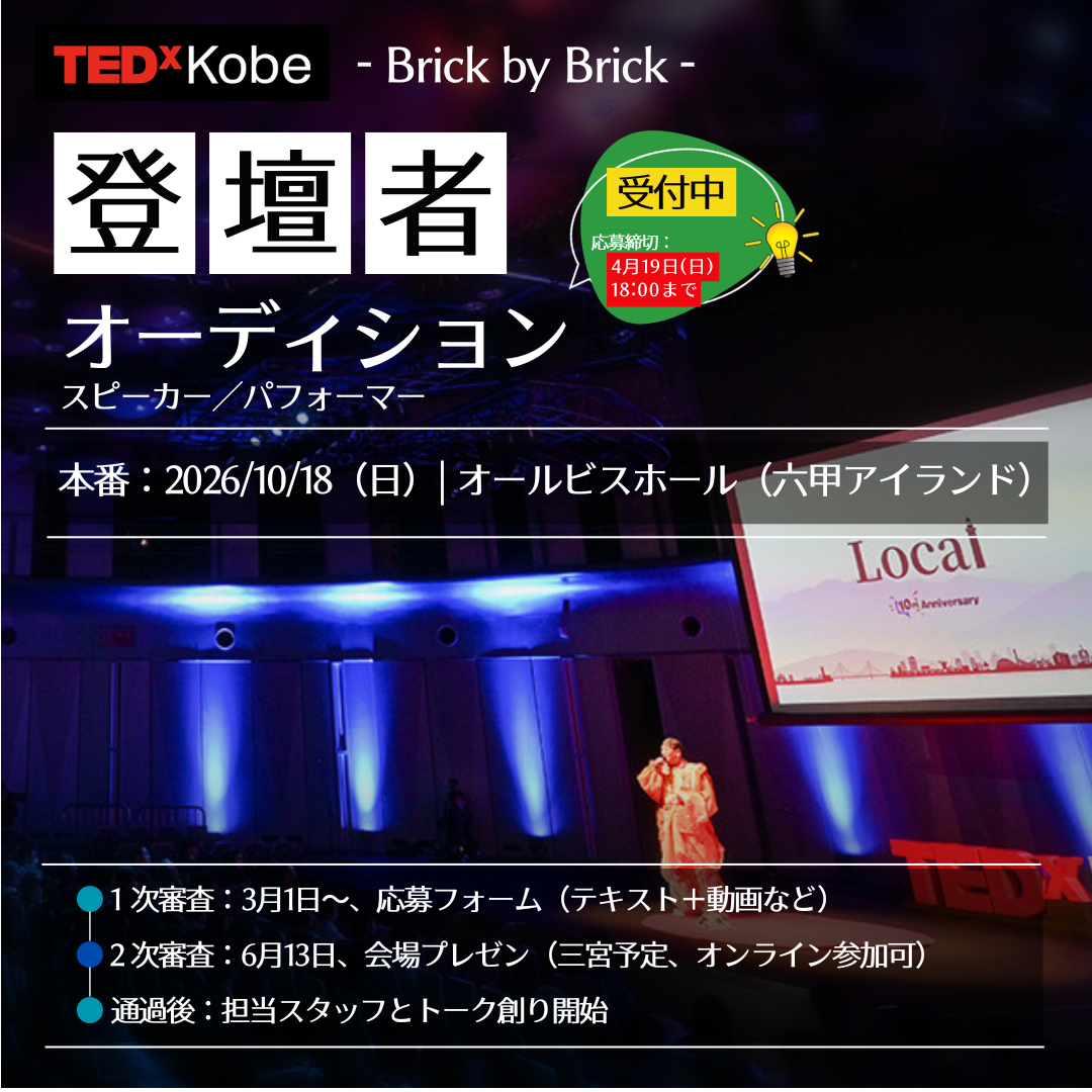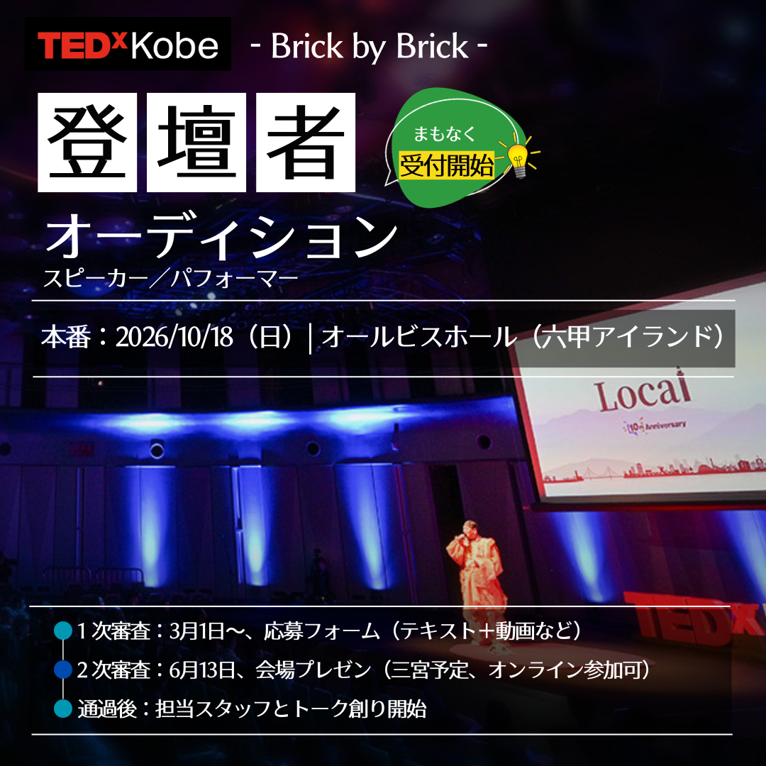TEDxKobeでは登壇者を募集しています。スピーカーの募集はこのWebサイトや各種SNSで告知しています。